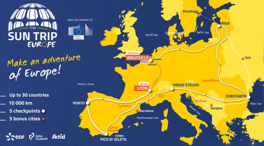 Участники Sun Trip в этом году проедут по петле длиной 10 000 км от Брюсселя до Лиона через Ригу, Констанцу, Сьерра-Неваду и Порту.