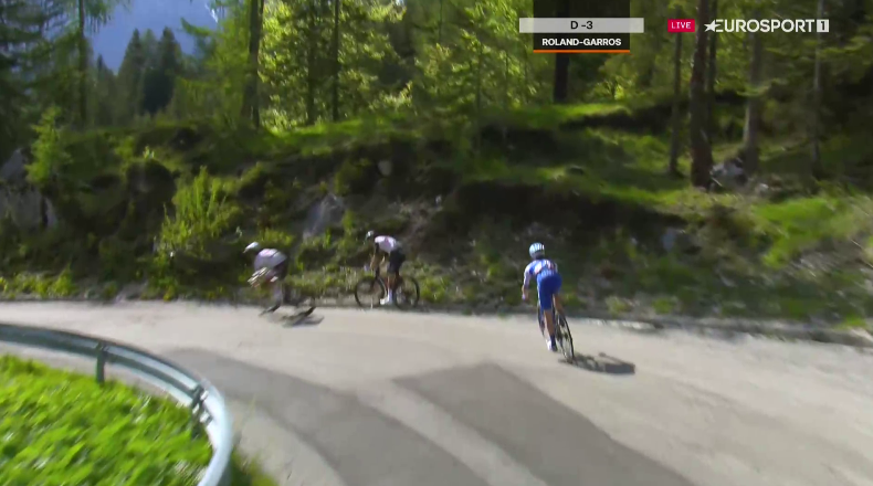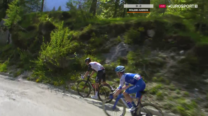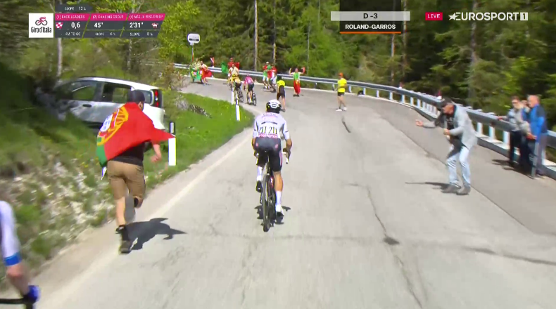 24-летний португальский гонщик команды UAE Team Emirates Жуан Алмейда не смог ответить на ускорение соперников Приможа Роглича (Jumbo-Visma) и Геранта Томаса (UAE Team Emirates) на финальном подъёме 18-го этапа Джиро д’Италия-2023. Вместе с Алмейдой оставался его товарищ по команде Джей Вайн, который помог минимизировать отставание. Однако, на спуске неверно рассчитанная траектория стоила гонщикам UAE Team Emirates нескольких секунд и потери ритма, хотя им повезло, что обошлось без падения.