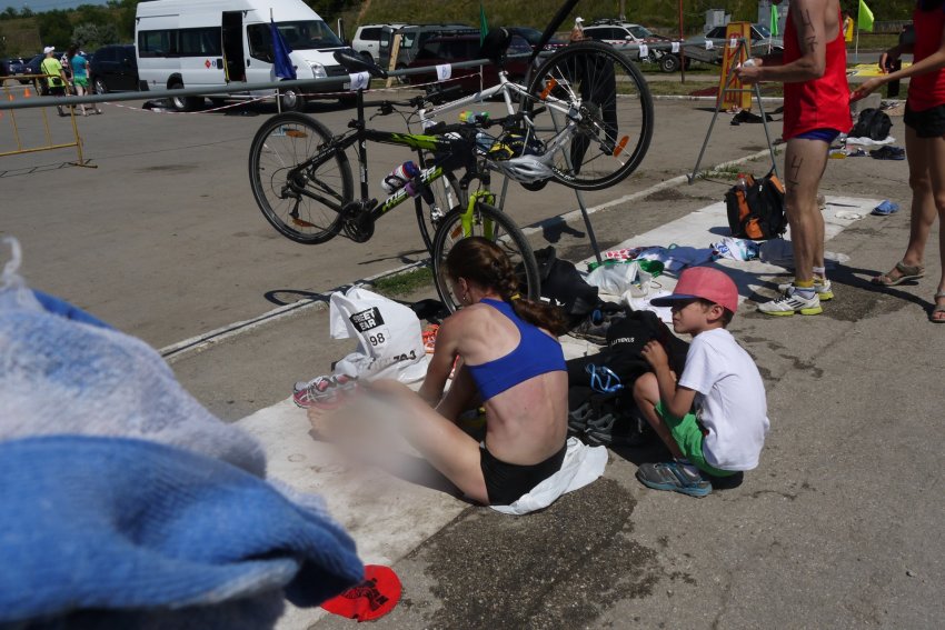 Меня ужасно трясло от холода, но мысли сдаваться уже вообще не было. Через несколько минут я окажусь в привычной для меня среде. На транзитке (на этих стартах было разрешено) меня ждал сынуля и муж. Они мне помогли быстро прийти в себя, одеться на вело этап.