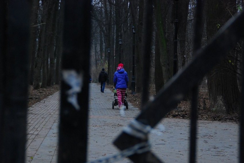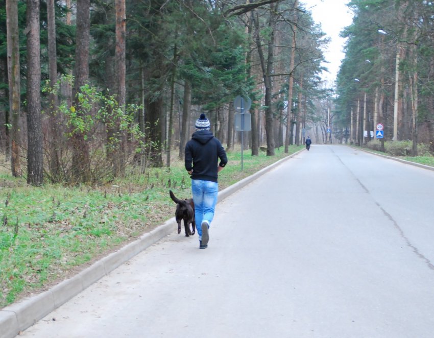 Но серая хмарь, повисшая над городом, нулевая температура и рабочее время делают свое дело. Из спортивно-физкультурного люда наблюдаю только двух голых по пояс мужиков, лупящих грушу на спортплощадке, и парня в джинсах на пробежке со своим лабрадором. Зато много мам с колясками.