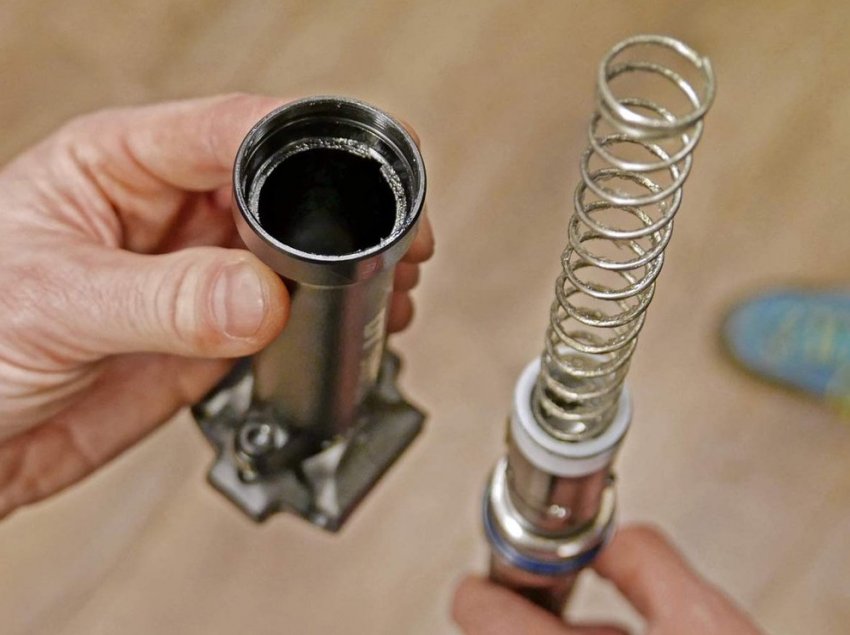 Верхняя часть подседельного штыря скользит по пластиковой втулке. Ряд стальных шариков, разделенных сепаратором наверху пружины — так называемый упорный подшипник — уменьшает трение при сжатии.