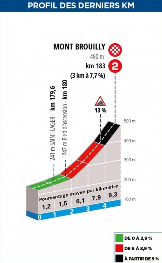 4-й этап - горный тест семью подъёмами второй и 1-й категорий. Этап финиширует в подъём 2-й категории Монт-Бруйи - 3 км со средним градиентом 7,7%, максимальным 13% , который в первый раз будет проходиться гонщиками за 39 км до финиша.