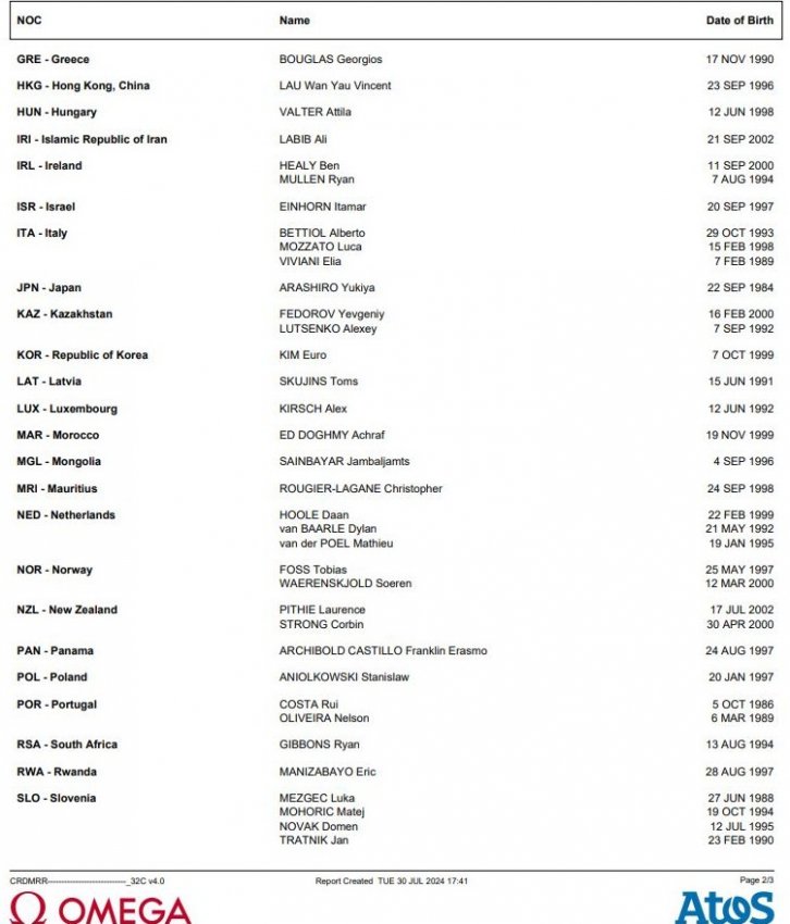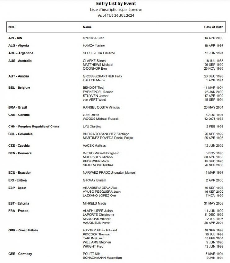 Предварительный стартовый состав мужской групповой гонки на шоссе на Олимпийских играх-2024:
