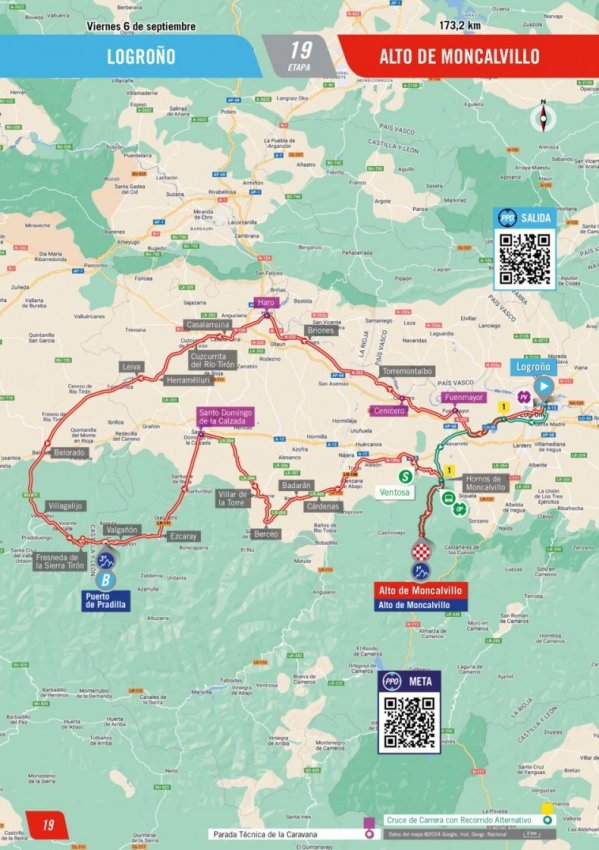 Девятнадцатый этап Вуэльты Испании (Vuelta a Espana)-2024 стартует в городе Логроньо (Logroño), который расположен в северной части региона Ла-Риохи, в 80 км к западу от Бургоса, на реке Эбро, на высоте 384 метра выше уровня моря. Логроньо был основан римлянами под названием Варейя приблизительно во втором веке до нашей эры. Однако, скорее всего, город как таковой начался от слияния Варейи, кельтского поселения Гроньо (брод) и римского же торгового поста Кантабрия, чьи развалины все еще можно видеть на территории города.