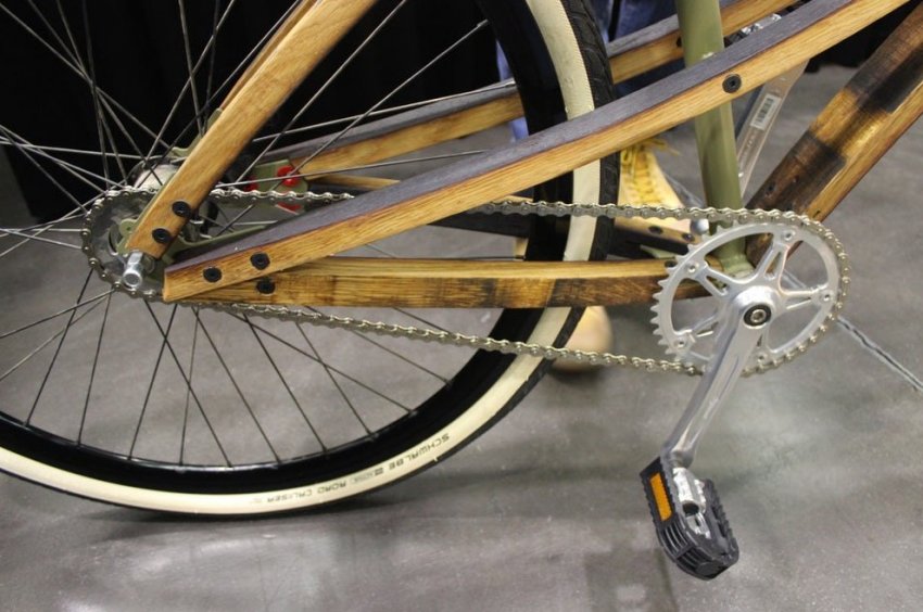 Получившийся в результате прототип Cooper Bicycle имеет плавные изгибы, интересную фактуру поверхности и окраску. Так вышло потому, что виноделы обжигают бочки изнутри, чтобы добавить вкуса вину, а в процессе вызревания вино окрашивает древесину. Рейку почти ничего не пришлось добавлять к отделке дубовой рамы.