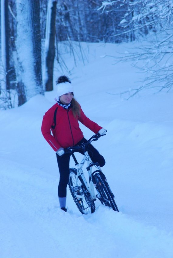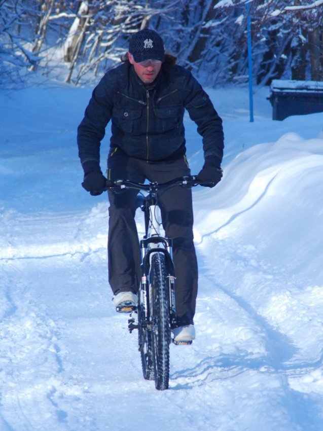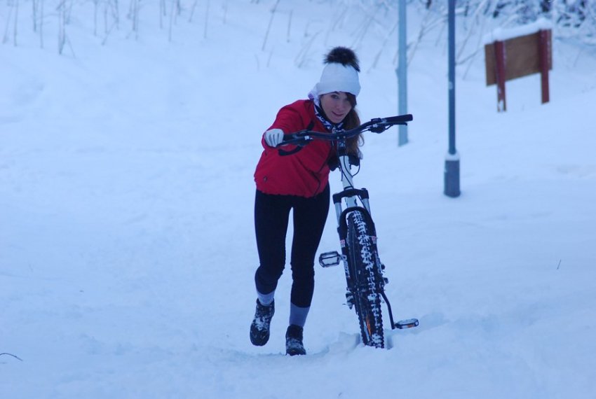 В общем, схватив мой тяжелый кантрийник GIANT, мы помчались на Воробьевы. Этой зимой, еще в декабре, я открыл для себя кайф катания по снегу. Если у вас есть подходящий вел и подходящие ноги — это неописуемо! Не знаю, как сказать, на что это похоже, но фишка в том, чтобы ловить себя на тех волнах и в тех поворотах, в которые вы ныряете при помощи снега, скорости и вела. Для начала надо найти оптимальную для вашей формы плотность снежного покрытия и рельеф. Меня в первый выезд в Сокольниках очень заводило с разгона проскакивать снежные поля по 15-20 сантиметров глубины и 2-3 метра длины. Когда вел на скорости входит в снег, баланс резко меняется, он становится под тобой вольным мустангом, которого надо укротить, удержавшись на нем. В гору и с горы — отдельная песня, начинает нести то перед, то зад, надо успевать все ловить и работать одновременно и передним и задним тормозом, чтобы не совершить кувырок.