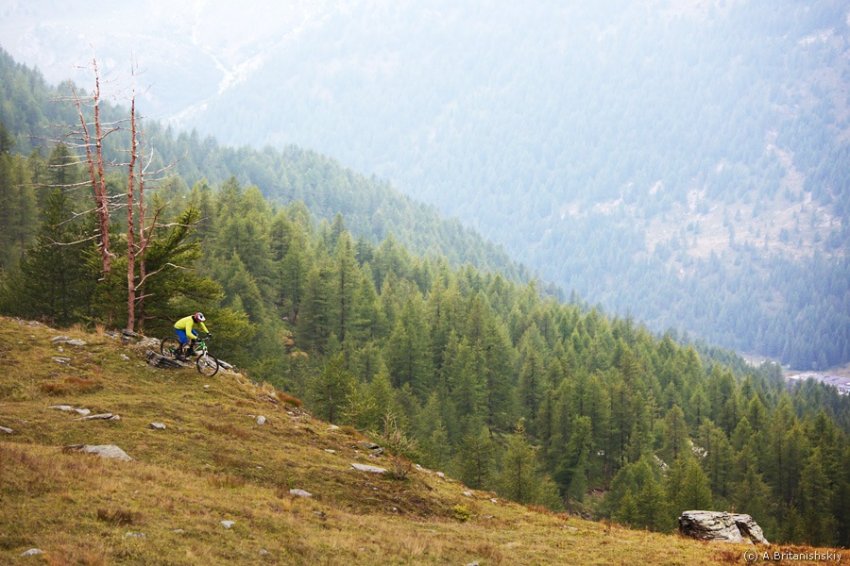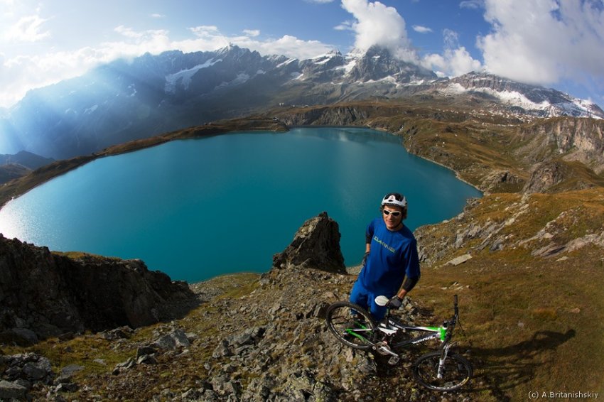 Байк-трассы обслуживают два подъемника, первый 2050-2550 метров, там находится небольшой байк-парк с трамплинами и волрайдом и основная, очень грамотная трасса, так удачно закрученная, нигде не нужно тормозить слишком много, великолепно. Вторая трасса «для новичков», типичная для Альп, внизу идет просто по дороге. Больший интерес представляют пешеходные тропки, по которым кататься вроде бы нельзя, но если очень хочется… Самая интересная из них идет под всей горой Монте Червино, на большой высоте вокруг курорта, рядом с ледником. Минус этого подъемника в том, что это вагончик-маятник, который неторопливо стартует по мере накопления людей, параллельно идущие быстрые «яйца» при нас не включали. Вторая очередь завозит с 2550 на 2800. Оттуда, вокруг бирюзового озера с дамбой, идет длиннющий трейл, словно созданный для эндуро-тренировок. Участки по траве, камням, дороге и глубоким контруклонам, там есть все! По пути в рельеф вписаны дропчики, шорчики, трамплины и другие препятствия.
