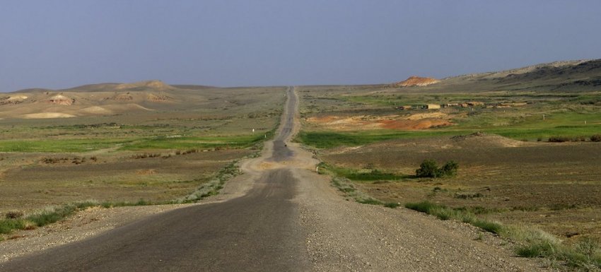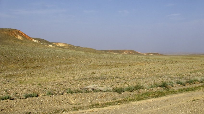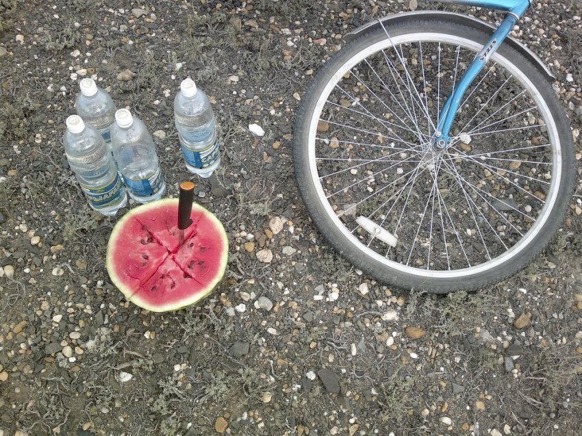 После Калгуты трасса становится совсем отвратительной. Местные водители обладают исключительным искусством даже на полутора-двухметровую насыпь натащить поверх старого, но крепкого ещё советского асфальта толстый слой грязи, а потом раздолбить его в мелкую стиральную доску. Многие при этом ещё и принципиально едут по обочине, игнорируя асфальт вообще; видишь такого сзади себя и даже не понимаешь, в какую сторону ему уступать. Вечером за час проехали километров семь и встали, укрывщись от дороги за невысокими холмиками. Едим арбуз. У Ирёнка развалились кроссовки - впрочем, здесь они уже ни к чему. Почти новые были, даже года не проходили. Впрочем, и то неплохо; дьявол как-то купил у китайца душу - так она сломалась через неделю.
