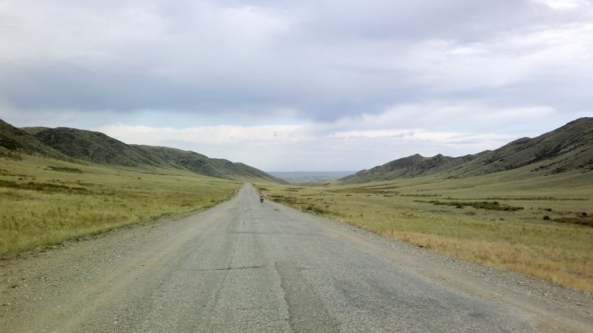 После небольшого озера дорога становится лучше, но начинается длинный нудный подъём к узкому горному проходу в долину Курчума. Он невысокий, всего-то 150 м набора, но однородный и почти непрерывный. И ехать уже тяжеловато, и пешком идти ещё вроде бы глупо.