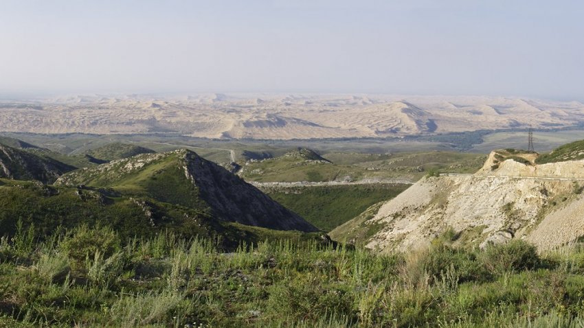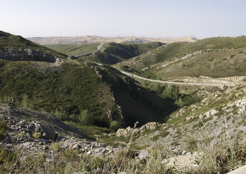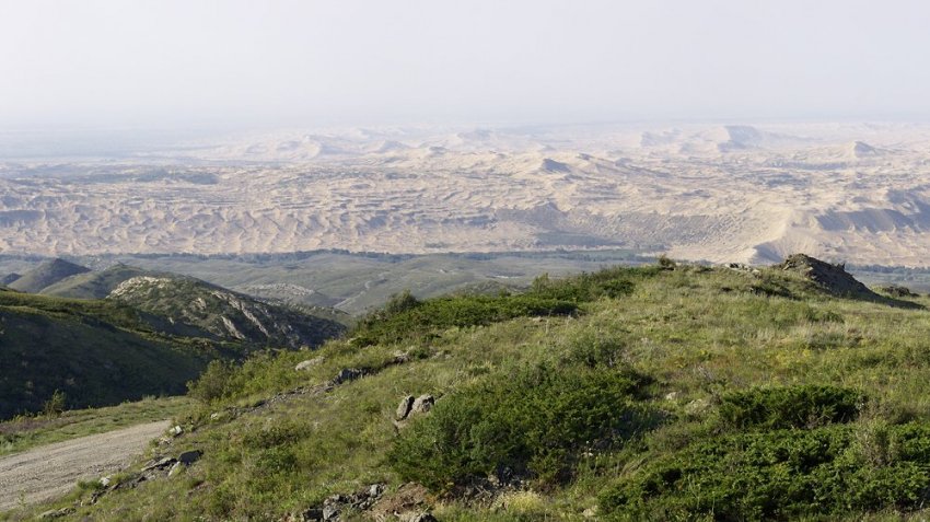 Перевал Мраморный — по сути, просто точка на краю плато, подъёма с этой стороны на него нет. Только спуск 700 метров. С перевала открывается роскошный вид на китайские барханы. Говорят, по ночам за ними видно зарево какого-то большого города, но мы проезжали уже утром, и посмотреть сверху на ночной Китай нам не удалось. Тьфу! Что за идиот спамит мне смс-ками, я же в отпуске, #####... А-а, «Билайн приветствует вас в Китае!»