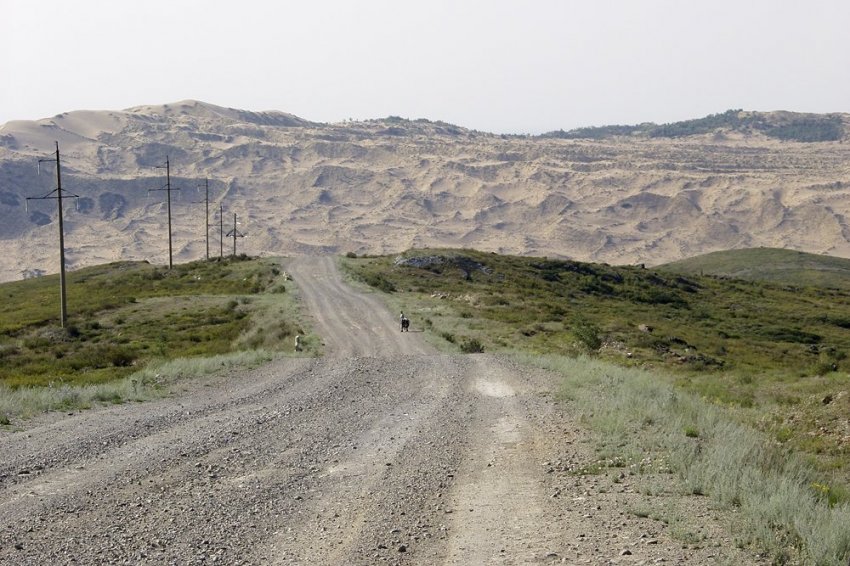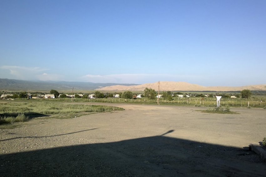 По мере спуска разглядываем барханы сверху вниз, потом по горизонтали, потом они уже намного выше нас... Зелёнка внизу — речка, по которой проходит граница. Когда-то эти места заселяли русские крестьяне. При Столыпине Северо-Восточный Туркестан был одним из центров переселенческого движения, задолго предвосхитив и Турксиб, и хрущёвскую целинную кампанию. Ну, а бесплодные пески за речкой для них интереса не представляли, так они и остались китайскими. Дорога тянется вдоль колючки, на той стороне — застава с почти знакомым красным флагом. Какая же она всё-таки маленькая и круглая, эта планетка! И каким боком её ни поверни, куда ни поезжай, со всех сторон эта китайская граница.