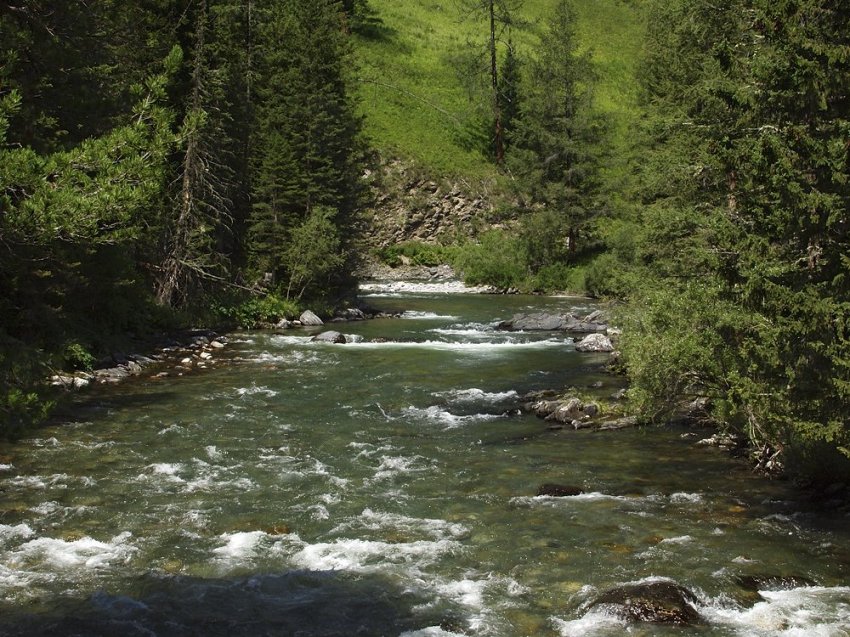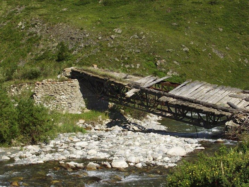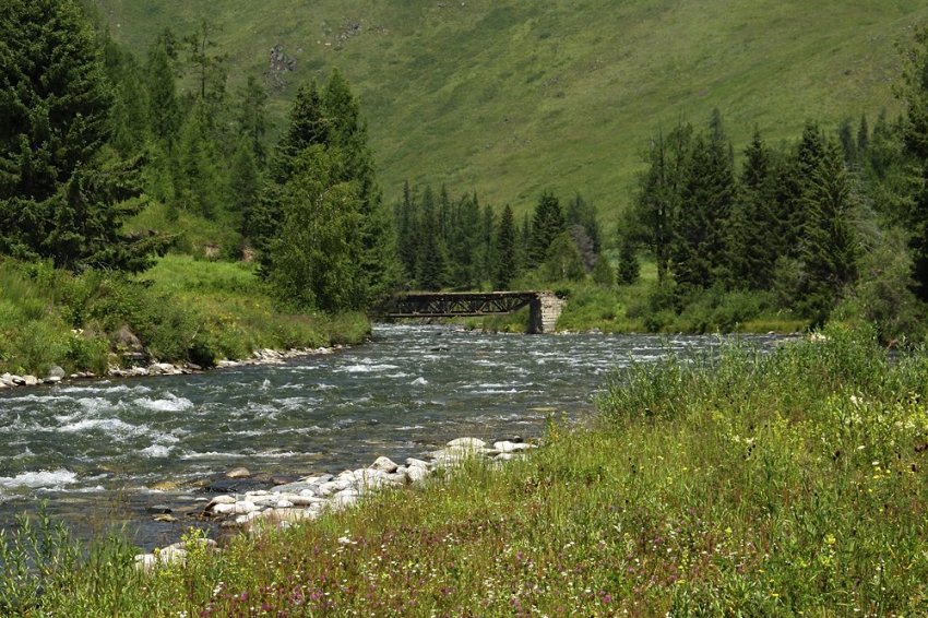 На выходе в долину Кара-Кабы два брода. Первый, через приток, был всегда, а вот второй появился недавно, мимо бывшего Первого моста, снесённого паводком года четыре назад. Перестоял сей мост и царский режим, и коммунистическую власть, но вот немного не дожил-таки до своего столетия.