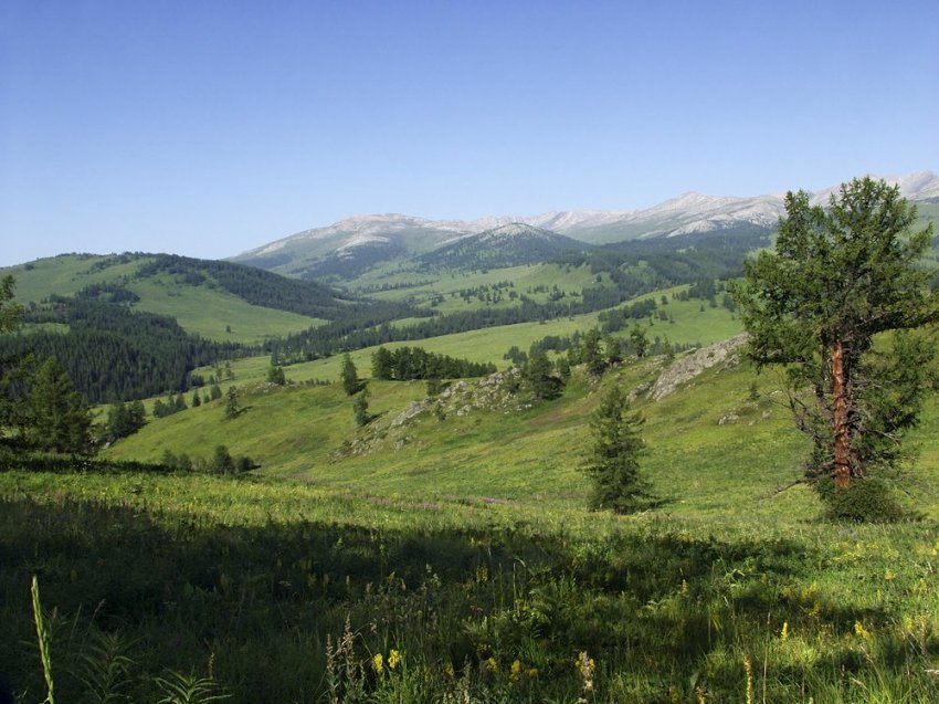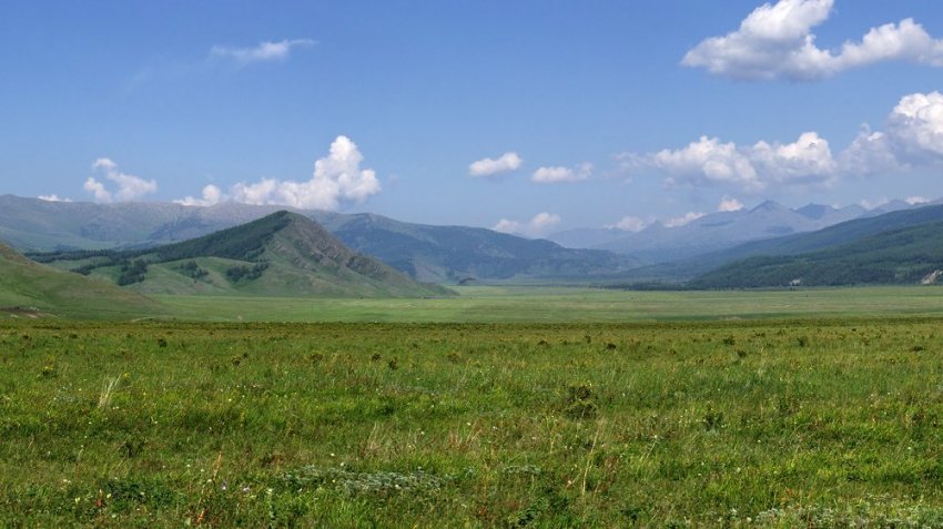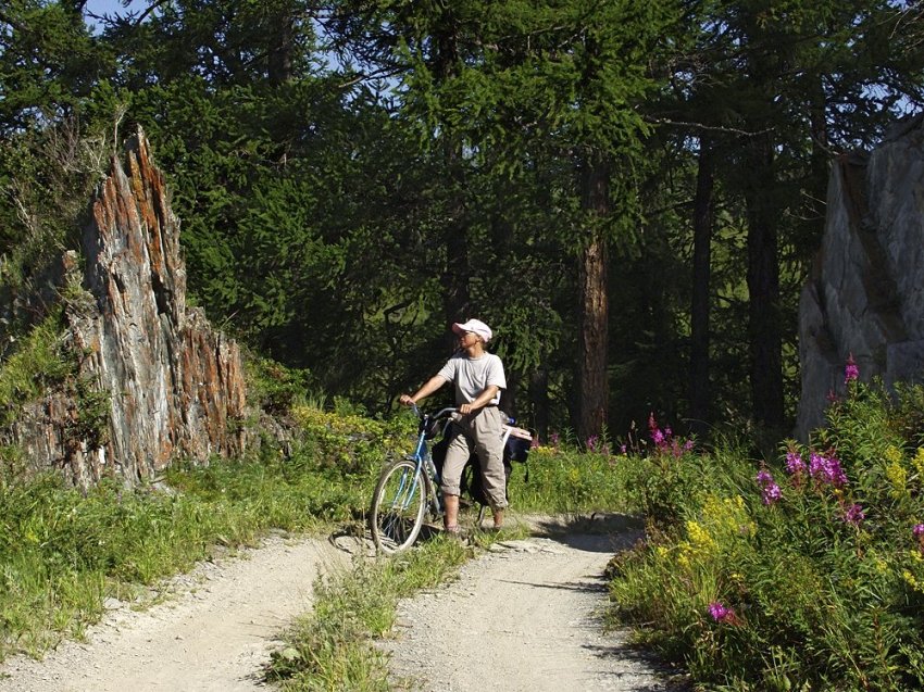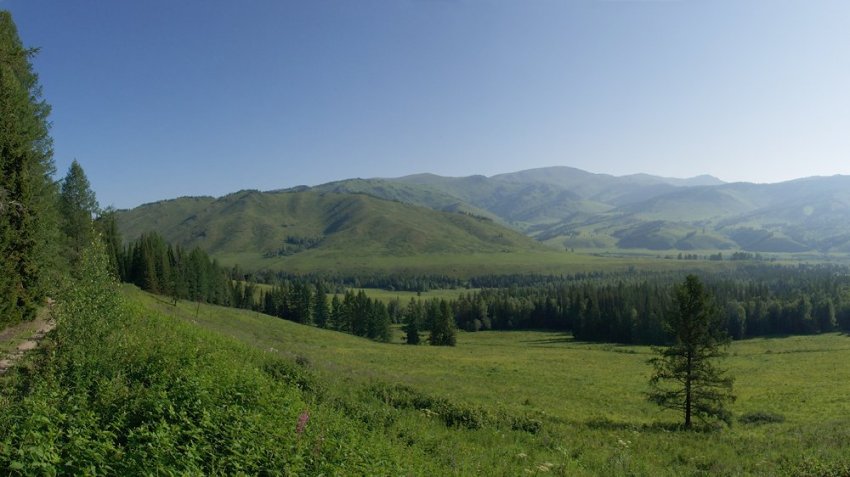 Добираемся до границы леса, дальше уже нормальный серпантин. С перевала открываются неплохие виды, пожалуй, даже получше, чем с Бурхата. На спуске ручьёв много... Даже слишком. Кое-где даже гати. Почва на этом склоне становится мягче, лужи, соответственно — глубже и вязче. И — чорт побери... Кажется, на этом хребте не обошлось без нечистой силы, притом сильно нерасположенной ко мне лично. Задняя втулка добита окончательно: скрежещет, грохочет на все лады, клинит в заторможенном состоянии, и провернуть её, чтобы ехать дальше, удаётся только с помощью шаманских заклинаний в адрес известной всем матери. В меру моего знакомства с её (втулки, а не матери) внутренностями страшно даже представить, что в ней сейчас творится, очевидно, стёрлось и развалилось всё, что могло. Но двигаться как-то надо, чинить её здесь, на середине спуска, мне банально нечем. И уже не до красот альпийских лугов над Маркаколем: доехать бы до Урунхайки, там хоть какая цивилизация, на худой конец, можно будет сгонять дальше в Алексеевку за запчастями... Хорошо бы сразу колесо в сборе, ну, или хотя бы новую втулку. А не сложится — значит, новый говновелосипед. А также, по списку: ведроидофон, топор, батарейки...