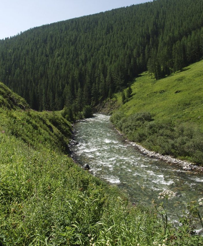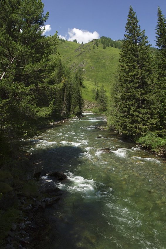 Да, глупо оно тогда получилось. Стояли мы почти здесь же, чуть ниже в этой котловине, там ещё та-акая клубничная поляна была по берегу... А на следующий день, на одном из первых порогов, я вытащил фото и побежал снимать прохождения товарищей, небрежно бросив лодку на отмели. Вон оно, ущелье, начинается, речка вгрызается в хребет, а нам завтра ехать правее, к перевалу через него же. Пока снимал — лодка ушла. И ладно бы просто ушла, поймали бы, но ушла полураспакованная. И всё, что из неё могло вытрясти и вымыть, — всё вытрясло. Мы её, конечно, догнали ещё до китайской границы, ну, пришлось ради этого вдвоём с Сергеем лететь всё ущелье с ходу, включая водопад, но уже было поздно. Местные хариусы, небось, до сих пор ту семипалатинскую тушёнку доедают из проржавевших банок, и московскими шоколадками из моей гермы закусывают. Хуже всего, что ушла вся кухня — по степени тяжести эта беда в походе третья, после трупа/травмы и утраты судна. И Ирёнок меня до сих пор пилит за жёлтенький австралийский купальничек, который она в последний момент подпихнула мне в лодку.