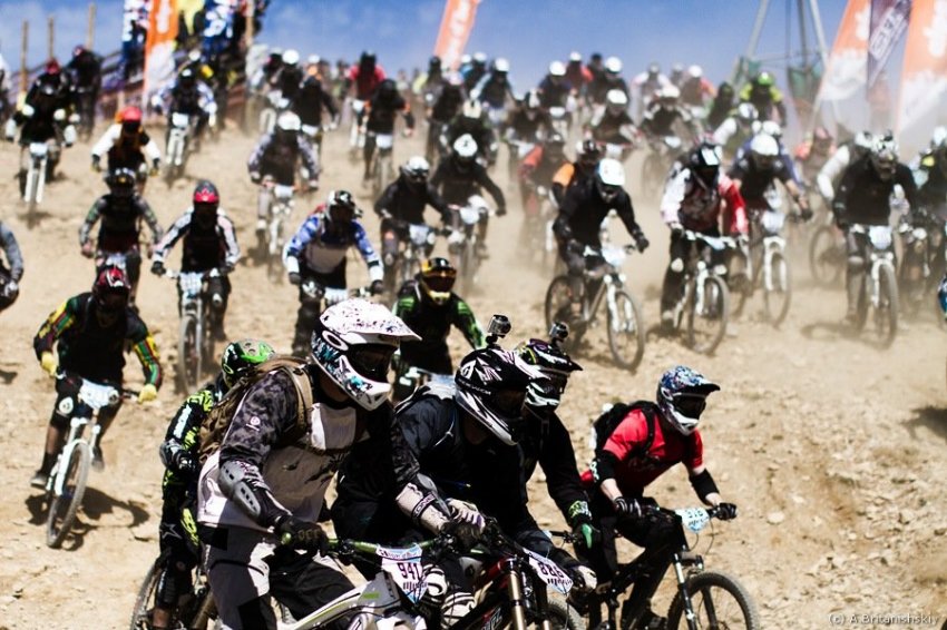 Миша очень помог и подробно объяснил все тонкости участия в такой гонке, правда, проверять пришлось на своем опыте. Например, подъем на старт вместо расчетных двух часов занял все-таки больше из-за особенностей подъемника, ведущего на старт, — это маятник, который вмещает не так много людей, а зарегистрировавшихся участников между тем почти 2000 человек! Как понимаю, многие опоздали на свой старт, я же прибыл всего за 10 минут до «построения». Важнейший момент эндуро гонки, который заключается в занятии своей стартовой позиции в линии. Здесь пришлось немного растолкать народ, и стать гордо в середине первой линии. По счастливому стечению обстоятельств мне досталась позиция в первой линии, что критически влияет на финальный результат. Обычно впереди люди с хорошим рейтингом и для новичка это большая удача. Всего стартует восемь-десять рядов по 20-25 человек, правда, судя по финальным протоколам, на старт каждой группы выходили все таки меньше 200 человек. Еще один важный момент — выбор байка, трассу Мегаваланш не зря называют в календаре «ДХ Марафон», а не «эндуро». В частности, значительная часть трассы квалификации лежала через «черный ДХ трек», просмотр трассы откладывал до последнего, и в итоге в четверг ничего посмотреть не смог, Оператор или Кадабра? Миша сказал 5050, и я выбрал даунхильный Оператор, чтобы облегчить свою участь на разбитой в хлам ДХ части, но выбор оказался не совсем верным…