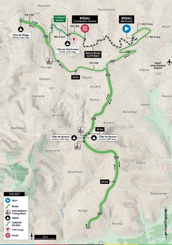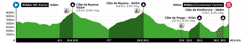 40,6-километровая дистанция проложена по ходу часовой стрелки на высотах от 1400 до 1653 м над уровнем моря в окрестностях столицы Руанды города Кигали. Со старта, расположенного на отметке 1520 м над уровнем моря, преодолев 6 поворотов, велогонщики устремятся на юг по длинной прямой дороге к подножию подъема Кот-де-Ньянза (Cote de Nyanza, отм. 1653 м, перепад высот 145 м, протяжённость 2,5 км, средний градиент 5,8%, максимальный градиент 8%). На вершине подъема будет расположена первая промежуточная отсечка времени.