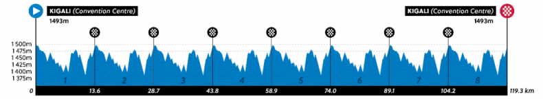 Подъёмы Кот-де-Кигали-Гольф (Cote de Kigali Golf) протяжённостью 800 м со средним градиентом 8,1% и Кот-де-Кимихурура (Cote de Kimihurura, отм. 1468 м, перепад высот 82 м, протяжённость 1,3 км, средний градиент 6,3%, максимальный градиент 11%), включающим 1,3 км секцию брусчатки, уже знакомы участницам по индивидуальной гонке на время. Однако на этот раз их будут преодолевать 8 раз на восьми кругах. Как и в разделке, Кот-де-Кимихурура будет также финальным подъёмом дня.