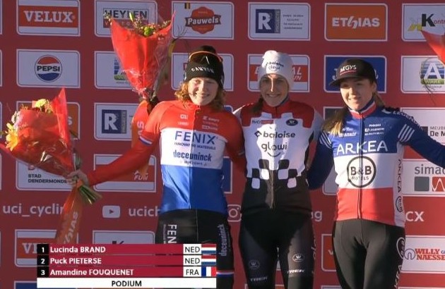 Люсинда Бранд (Baloise Glowi Lions) в очередной раз в одиночку пересекла линию финиша со значительным преимуществом, оформив 15-ю в сезоне и 11-ю подряд победу, выиграв этап Кубка мира UCI в Дендермонде. Гонка по сухой трассе началась на высокой скорости, Амадин Фукене (Amandine Fouquenet/ Arkéa - B&B Hotels Women), возглавила гонку сразу после старта, за ней поехала Селия Жери (Célia Gery/ AS Bike Racing / France Literie) и Люсинда Бранд. Трио создало небольшой просвет, но падение Леони Бентвельд (Leonie Bentveld) на песчаном спуске порвало группу и преимущество лидеров стало ещё больше.