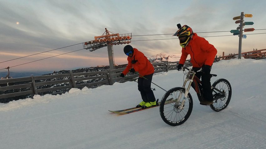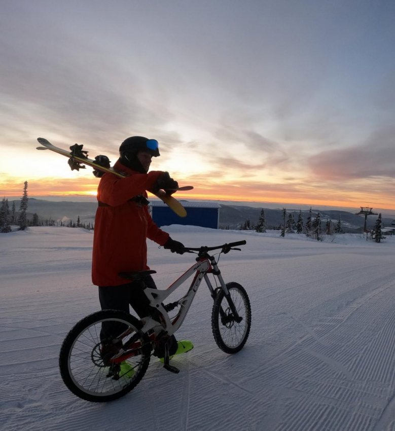 В Шерегеше в прокате Сектор Е познакомился с Николаем Горячевым - призером Кубка России по ДХ. Оказалось, что у него есть велосипед, и на велике есть зимняя резина. Лыжник для соревнований готовый на все нашелся в лице Гриши Корнеева.