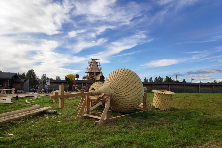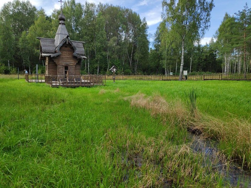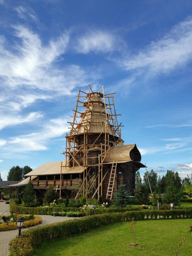 Капитальный монастырский забор, свежепоставленные строения из заводского цилиндрованного бревна... но смотрится почти аутентично, через несколько лет дерево потемнеет, посуровеет, и тогда уже никакая школота, в натуре, не отличит от Кижей или Малых Корел. Да, тут всё серьёзно - недаром сам брат Кирилл конкретно прилетал на освящение. (За монастырём, в бурьянах - вертолётная площадка из армейских бетонных плит.)