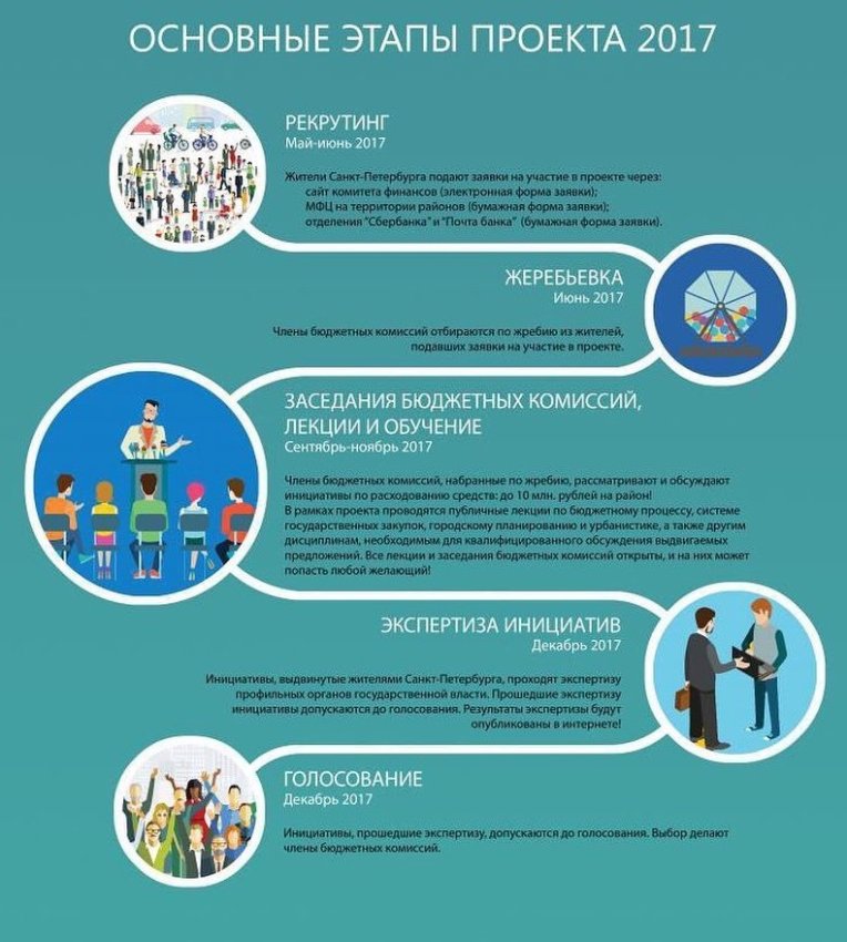 Любой житель Петербурга без всякой прописки может стать участником «Бюджетной комиссии», которую выбирают через жеребьевку с 17 по 30 июня. Если жребий выпадет на вас, то можно будет доработать и изменить свою идею, благодаря лекциям по урбанистике от разных экспертов, полномочиям и особенностям работы комитетов. В конце каждый из 20 членов Комиссии презентует свою готовую идею, другие — голосуют. Проекты-победители получат средства в пределах 10 млн. рублей для реализации в 2018 году.