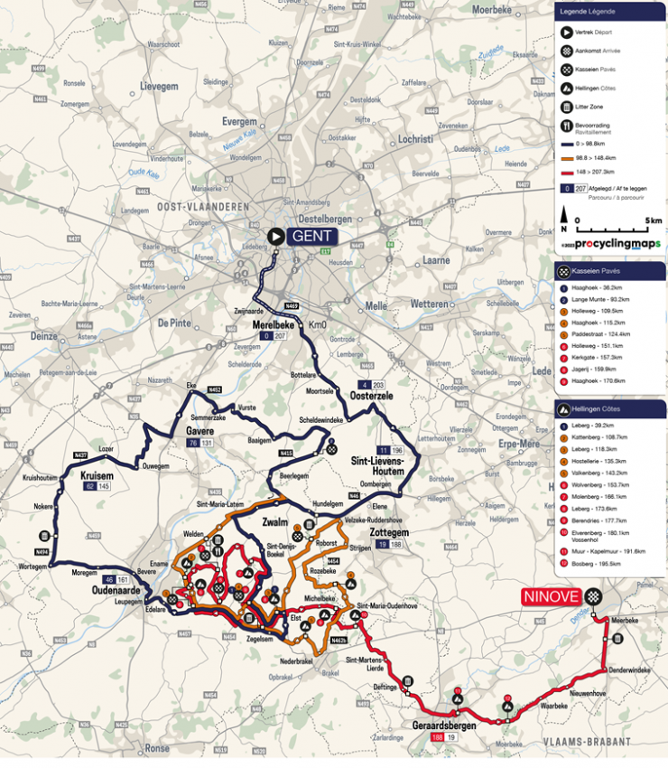 В маршрут вернётся отсутствовавший в прошлом году Моленберг, после которого за 36,7 км до финиша пойдёт триптих Хаагук (Haaghoek) – Лерберг (Leberg) – Берендрис (Berendries), а за 15,7 км - легендарная ключевая связка Мюр ван Гераардсберген (Мюр-Капельмюр) + Босберг (Мюр ван Гераардсберген - 475 м со средним градиентом 9,3%, а на самых крутых участках – 20%, Босберг – 980 м со средним градиентом 5,8%, часть подъёма вымощена брусчаткой). До нового места финиша в Нинове после прохождения Босберга останется 11 км по равнине.