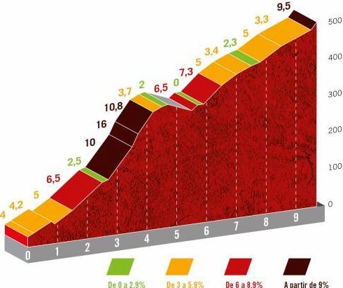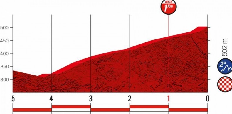 После 74 км со старта этапа начнётся подъём 3 категории Альто де Сан Антонино (Alto de San Antonino, отм. 402 м, перепад высот 363 м, протяжённость 9 км, средний градиент 4%, максимальный градиент 10%).