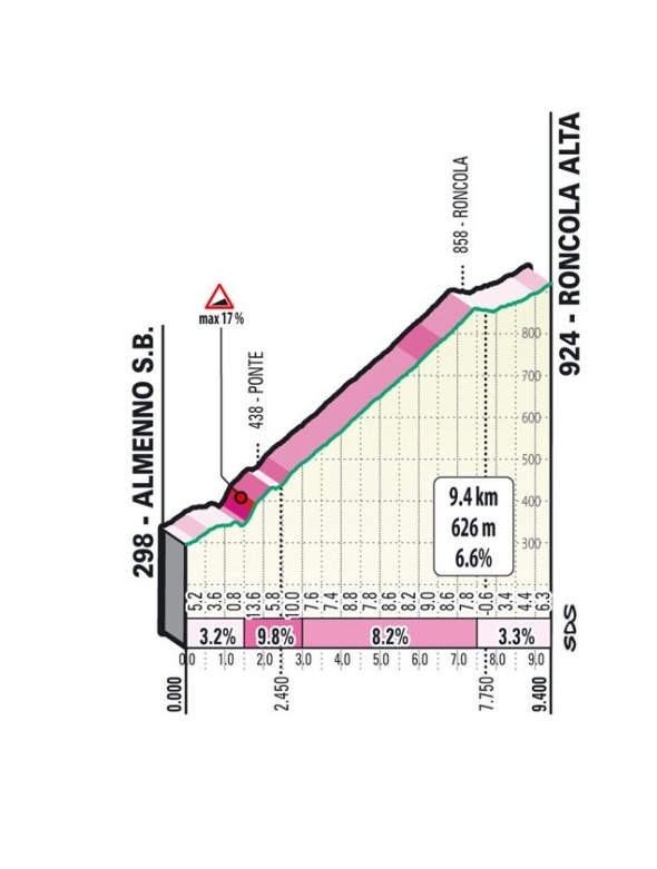 Сначала пелотон пройдёт подъём Ронкола (Roncola) - 9,4 км и средний градиент 6,6%. Первый километр и последняя части не особо крутые, но на отрезке от второго до третьего километра подъёма градиент подскочит до 17%,а затем на протяжении пяти километров средний градиент составит 8,2%. Когда вершина Ронколы будет преодолена, в ногах участников уже будет более ста километров гонки.