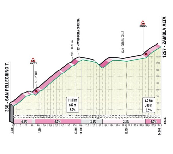 Вершина Дзамбла Альта будет пройдена примерно за 65 км до финиша. После 25 км скоростного спуска в долину реки Серио (Serio) начнётся последний большой подъём дня.