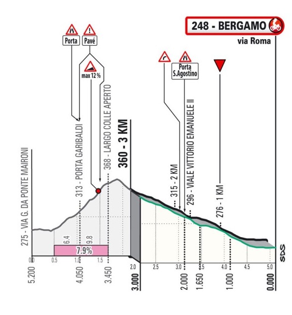 Финальные 3 километра — быстрый спуск к финишу на Виале Рома в Бергамо.