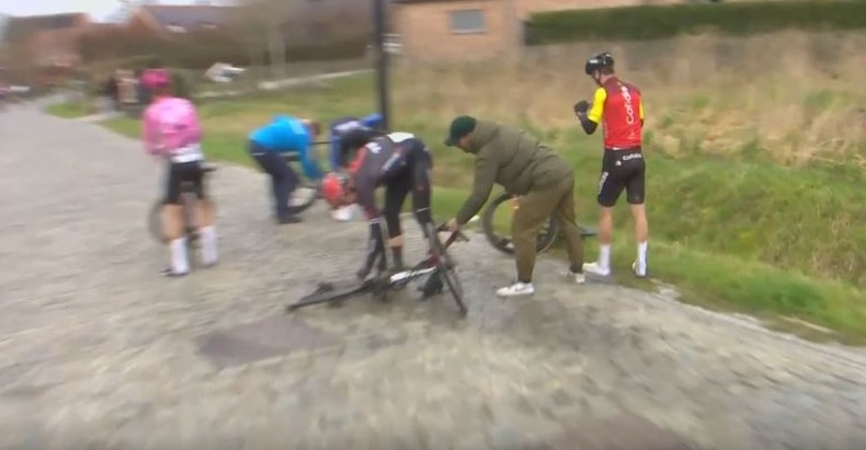 Планам Штефана Кюнга и команды Tudor был нанесён серьёзный удар. 32-летний швейцарский гонщик упал на брусчатке в решающей фазе гонки, за 20 км до финиша, и был доставлен в больницу в Бельгии.