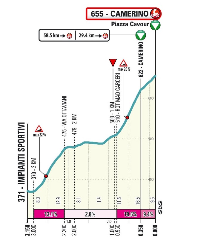 На этот раз он служит генеральной репетицией финального подъёма, хотя в финале добавятся дополнительные 200 метров. В первый раз это 3-км со средним градиентом 8,8%, причем первые 660 метров с 11,2%. Протяженность круга составляет 29,1 километра, и после второго проезда через Камерино он преодолевается еще дважды.