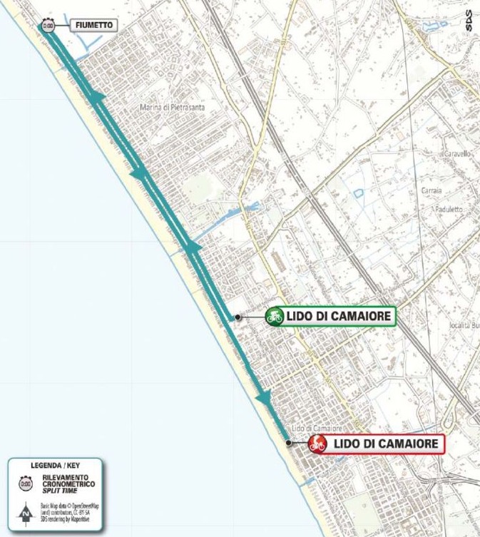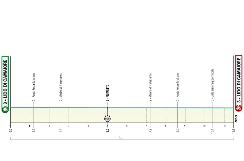1-й этап – самая плоская разделка в году. Идеально ровная трасса индивидуальной гонки на время протяжённостью 11,5 км состоит из двух практически прямых отрезков «туда и обратно» вдоль набережных Камайоре и Виареджо, с несколькими связующими поворотами и точкой разворота через 5,4 км после старта, где будет расположена промежуточная отсечка времени. Далее участники развернутся и поедут назад, в Лидо-ди-Камайоре, где шикана выводет на финальный километр.