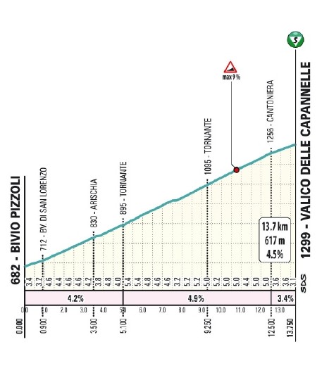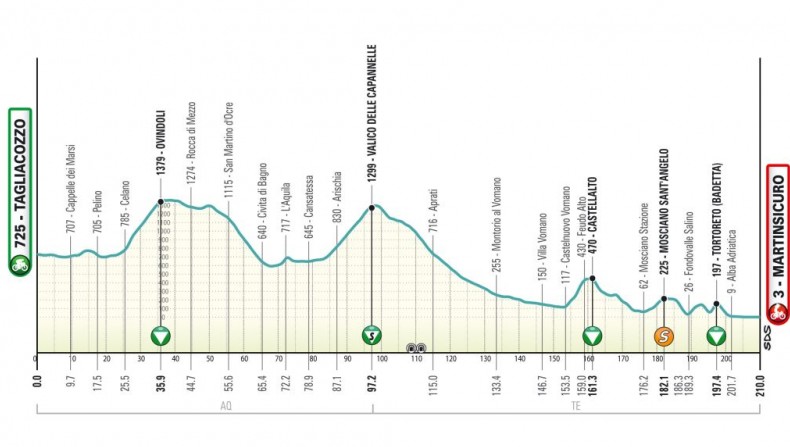 перевал Валико-делле-Капаннелле, горный перевал на высоте 1300 метров. Чтобы достичь его, гонщики преодолевают 12,8 км со средним градиентом 4,6%. После прохождения вершины до финиша остаётся еще 112,8 км.