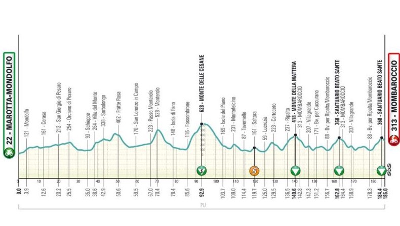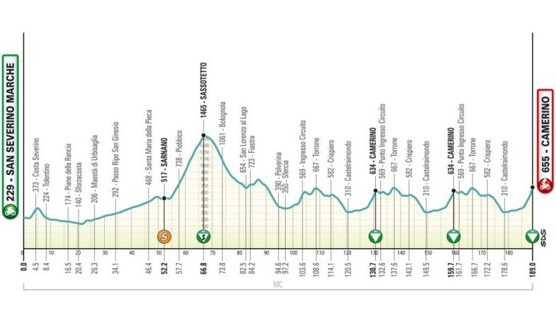 По кратчайшему пути от Сан-Северино-Марке до Камерино всего 21 километр, но гонщикам не позволят проходить такой лёгкий маршрут. Вместо этого они преодолеют большую петлю — сначала направляясь на восток, затем на юг — прежде чем достигнут подножия подъёма на Сассотетто через 53 км после старта, подъём высшей категории 13,1 км с 7,3%, максимальным 14% на середине.