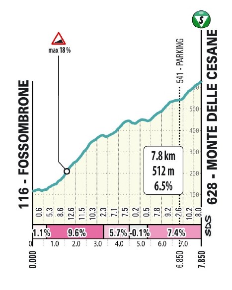 Через 88 км начнётся самый сложный подъём дня – высшей категории - Монте-делле-Чезане начнётся с 2,1 кмс градиентом 11,3%, а затем градиент значительно снижается. Общая протяженность Монти-делле-Чезане составляет 7,2 км со средним градиентом 7%.