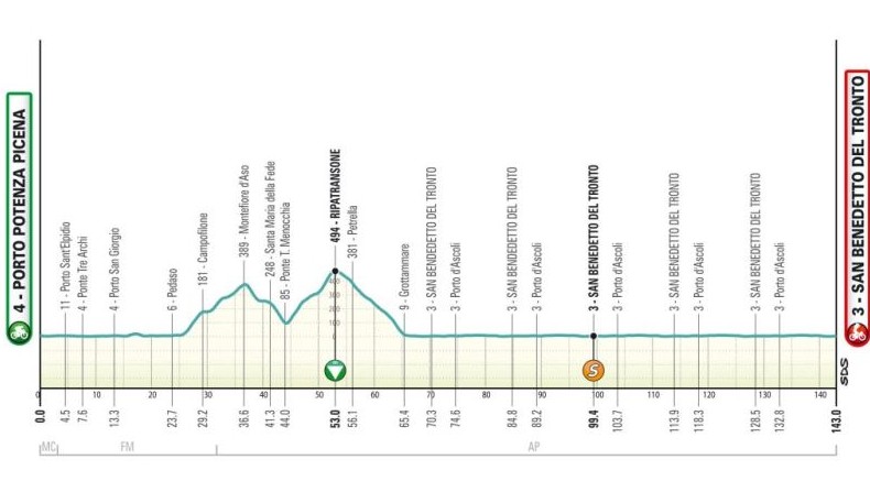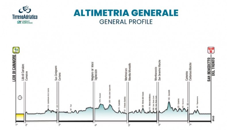 7-й этап, слегка холмистый в начальной части и совершенно плоский на последних 80 км. После равнинной начальной фазы протяженностью 25 км гонщики поднимаются к Монтефьоре-дель-Азо - 10,9 км со средним градиентом 3,4%. После спуска дорога снова поднимается на 8,5 км со средним градиентом 4,6% к Рипатрансоне, после чего спуск к Сан-Бенедетто-дель-Тронто.