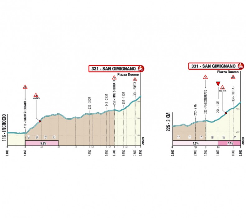 20-км спуск приведёт гонщиков в долину, и сразу начнётся подъём 3,8 километра со средним градиентом 5,5%, и после холмистого участка (включая 2,1-километровый отрезок с градиентом 5,6%) продолжается по пересеченной местности в направлении финала. Последние 1,2 км самые крутые - с 7,1%. Сложности добавит брусчатка и узкие улочки средневекового центра Сан-Джиминьяно.