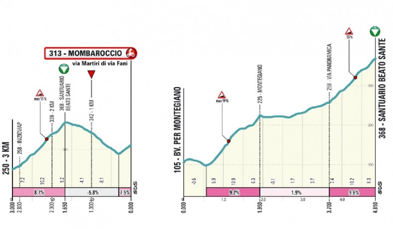 На скоростном спуске гонщики проедут финишный город Момбароччо, прежде чем отправятся на два круга по 21,6-км каждый. Сначала дорога продолжит идти под спуск, а затем последует подъём 1,6 км с 5%. Примерно через 10 километров равнины следует подъём к святилищу Беато-Санте - 4,2 км со средним градиентом 6,2%. Начальный и завершающий участки этого подъёма особенно крутые, с градиентом 9%. Менее чем через 2 километра после прохождения вершины гонщики снова пересекут финишную черту и отправятся на тот же круг – и снова 1,2 км с 9%, короткий отрезок равнины, и полуторакилометровый спуск к финишу.