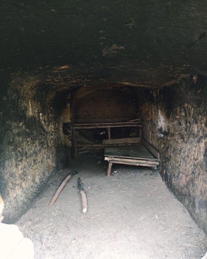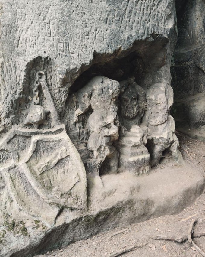 Первое впечатление у нас было, что перед нами пещера шаманов, где много веков назад люди говорили с духами предков. Головы у входа выглядят немного жутко, хорошо хоть не скелеты и черепа. Обратите внимание: в коридорчике высечены силуэты людей, будто стоящих в профиль. Бррр, будто идёшь мимо призраков.