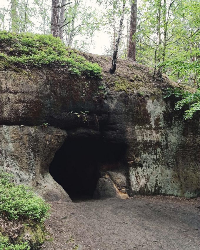 Мимо каменного змея, созданного всё так же Вацлавом Леви, мимо природных пещер и гротов доехали до пещеры с жутковатым названием Mordloch. С немецкого оно переводится примерно как "дыра для убийств". Бррр.