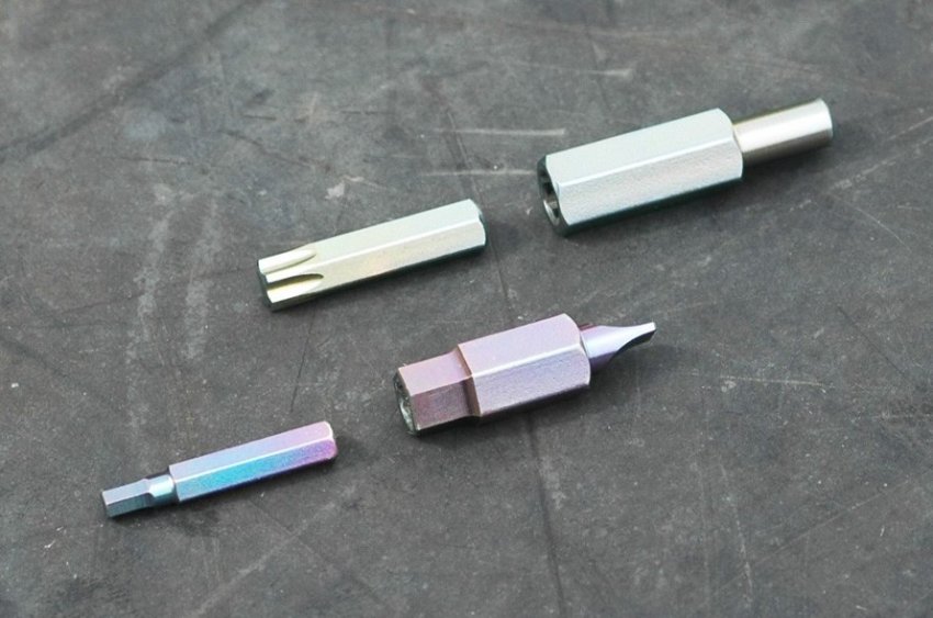 Основа «матрешки» — гаечный ключ, который делают из нержавеющей высокопрочной хромистой стали. Два конца ключа — шестигранники диаметром 8 мм. Поскольку эти концы полые, в них можно вставить две двусторонние сменные насадки меньшего диаметра. Эти биты тоже полые с одного конца, в них вкладываются самые тонкие биты.