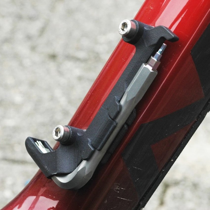 Размеры конструкции в полном сборе — 93 мм в длину и 43 мм в ширину (с учетом насадок). Весит мультитул всего 45 граммов. К нему прилагаются пластиковые заглушки, чтобы биты не протыкали карманы. Кроме того, есть дополнительный держатель для мультитула, который крепится на раму болтами вместо флягодержателя.