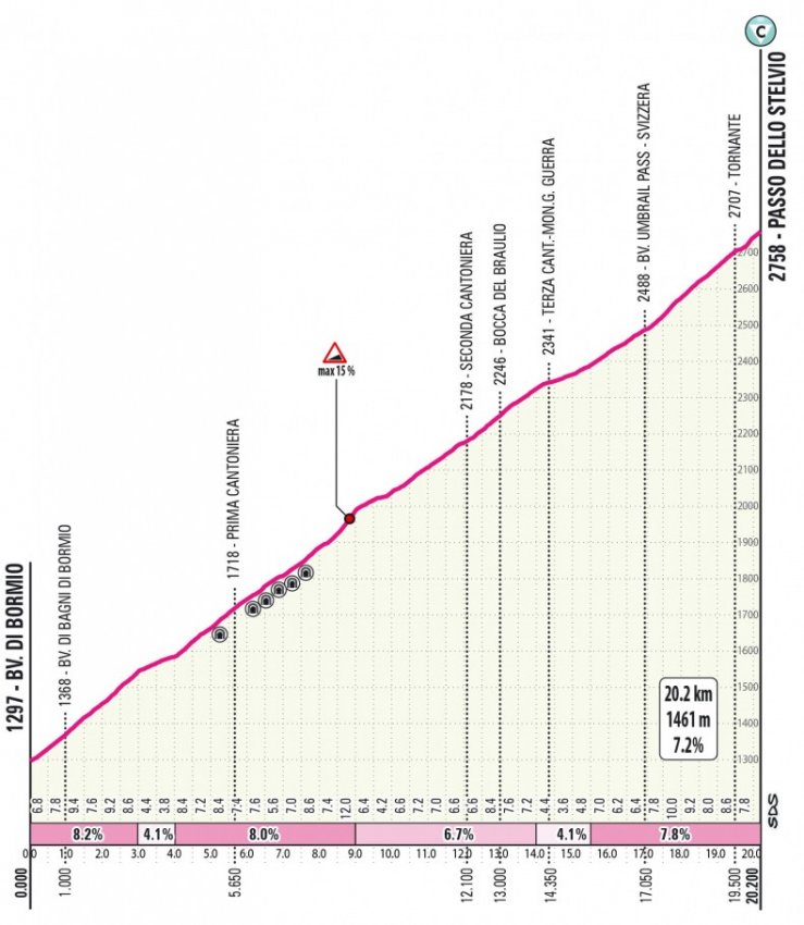 Третья неделя начнётся с 16 этапа с набором высоты 4400 м, прохождением наивысшей точки маршрута Джиро д’Италия-2024 — перевала Стельвио, Чима Коппи этого выпуска. Чима Коппи - 2758 м, в 11-й раз в истории Джиро присвоена Пассо делло Стельвио, которую будут преодолевать на 16-м этапе. Этап от Ливиньо до Санта-Кристина Вальгардена (Монте Пана) финиширует в подъём Монте Пана, где градиент на финальных 2 км превысит 10%.