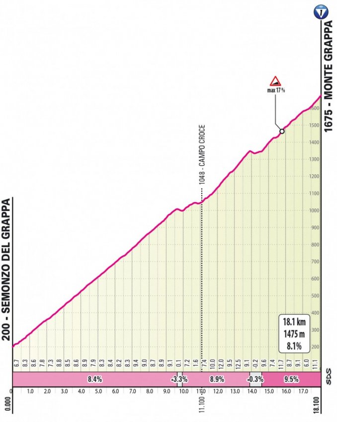 20-й этап до Бассано дель Граппа - 175 км с двумя подъёмами на Монте-Граппу, где в 2010 атаковал Винченцо Нибали, а в 2014 проводилась разделка, которую выиграл Наиро Кинтана.