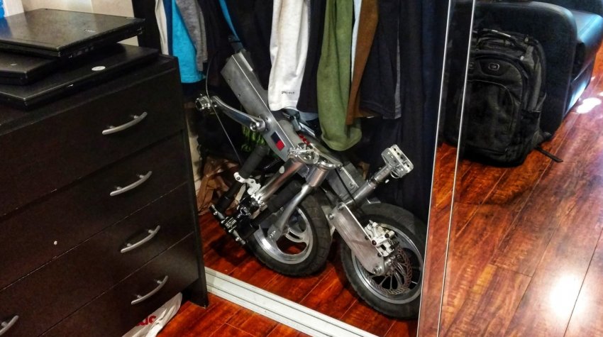 Внутри рамы проходит нестандартный приводной вал, который передает крутящий момент от педалей заднему колесу. В отличие от цепи, вал не требует смазки. С помощью встроенного шарнира он складывается заодно с рамой.