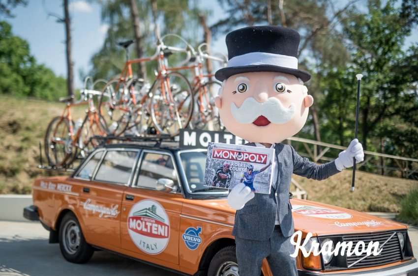 Талисман игры Монополия рекламирует ее «велосипедную» версию перед автомобилем велокоманды Molteni team, которой в свое время немало побед принес Эдди Меркс.