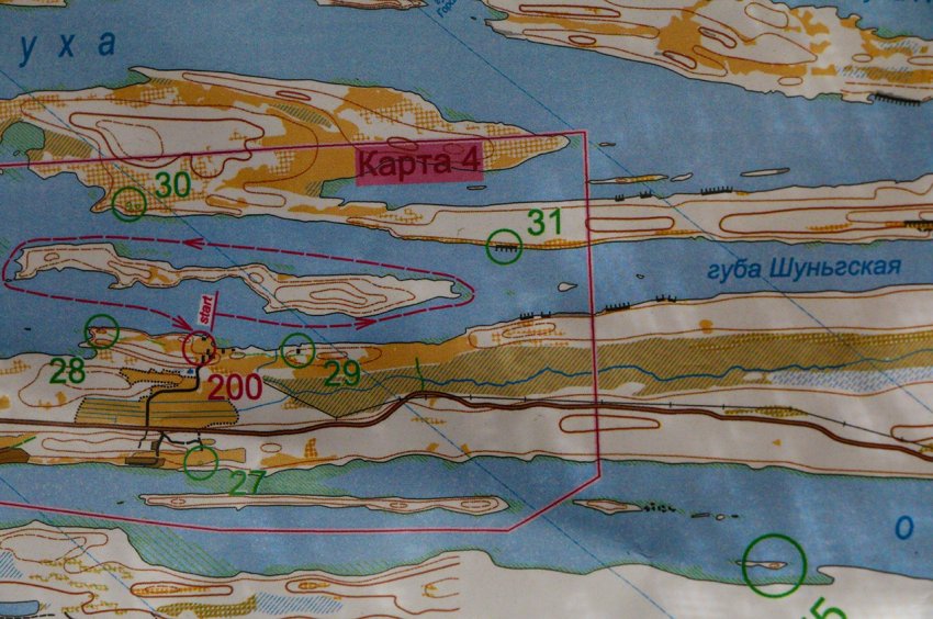На карте внизу скалы (КП 31) нарисована черная полоска с черточками, и Леха нашел! Чтобы найти КП, надо было плыть на байдарке вдоль скалы и заглядывать под выступы. Вот под одним из них он и прятался.