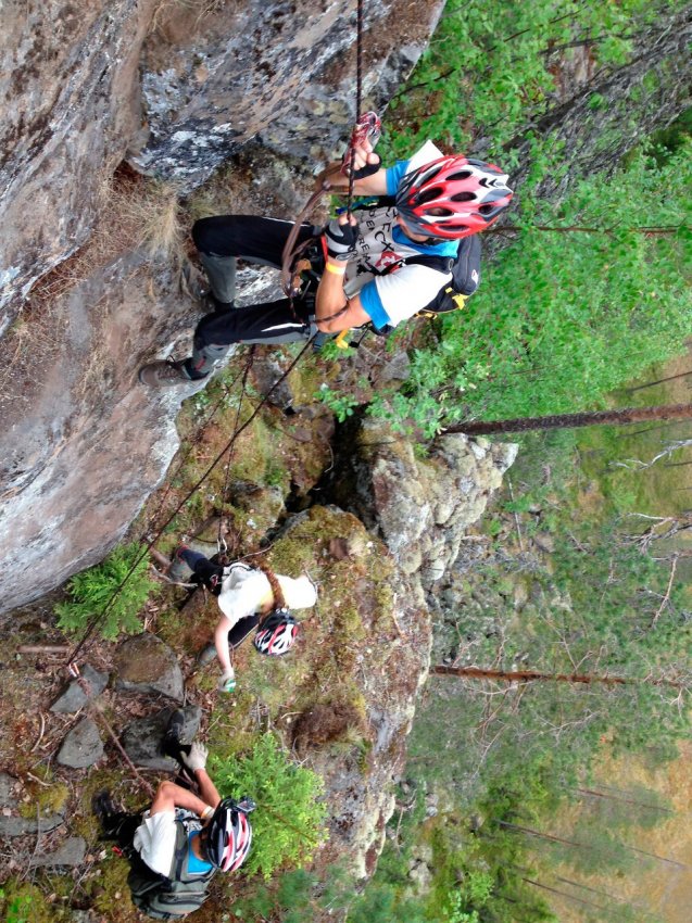 На нашу скалу надо было жумариться. Прямо под скалой (совсем не по технике безопасности) уютно устроились на каменной осыпи судьи-волонтеры, которых ели комары. Они сказали, что баллончик репеллента уходит у них за 3 часа. Быстро надев снаряжение, мы полезли на скалу.