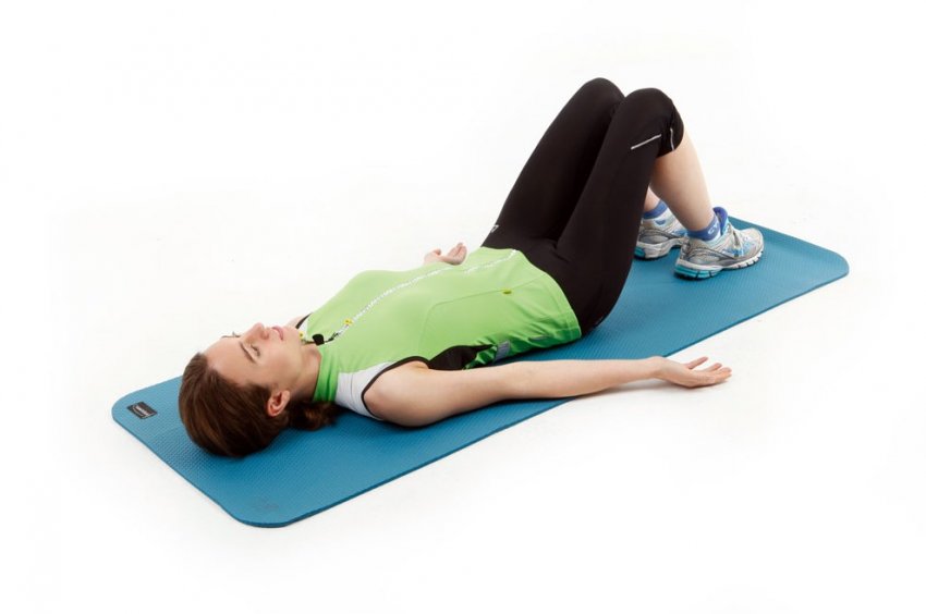 - Ложитесь на спину: ноги согнуты в коленях, ступни стоят на полу, руки положите вдоль туловища ладонями вверх.